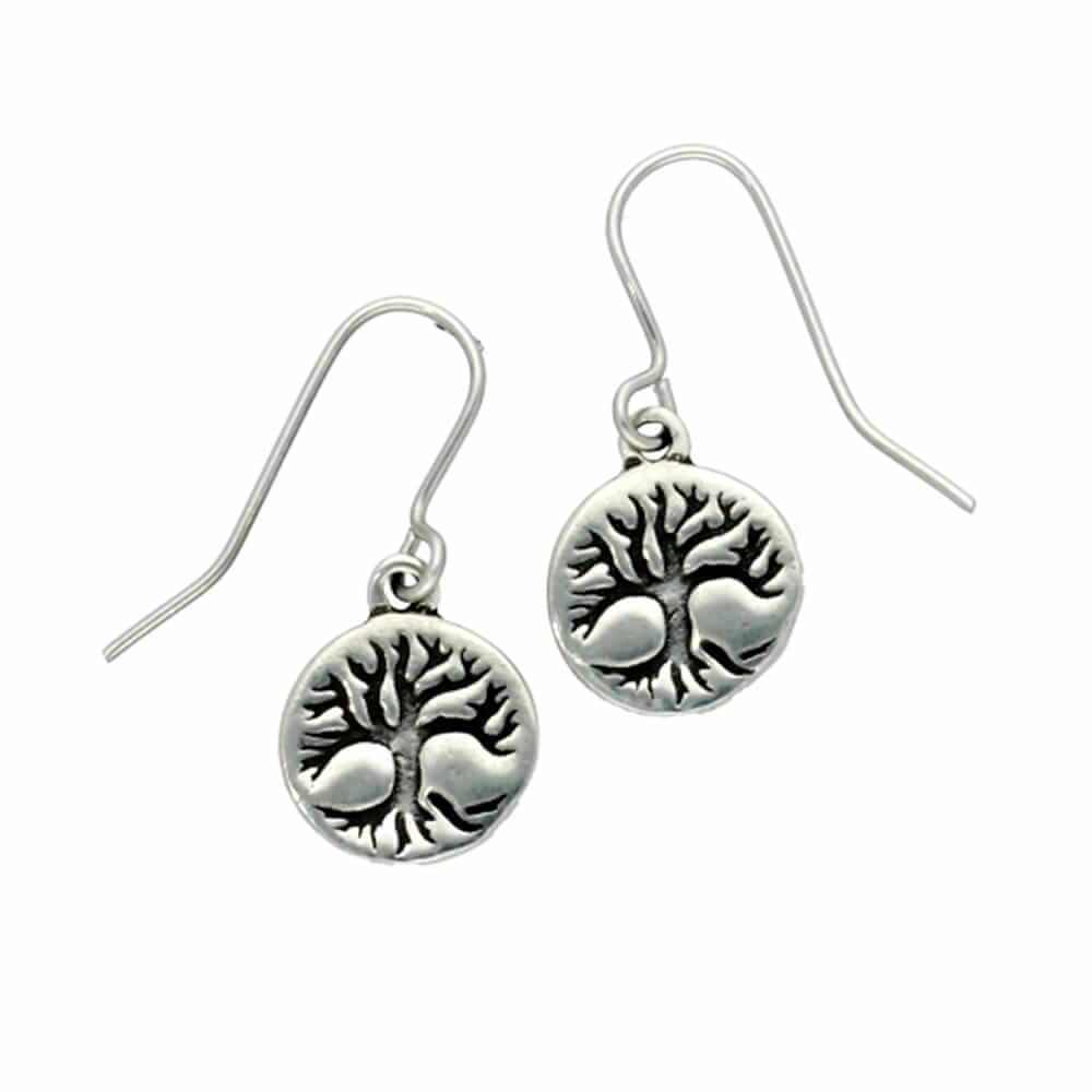 Levensboom schijfoorbellen – Kleine massieve tinnen schijfoorbellen met gegraveerd Keltisch Boom des Levens-ontwerp.